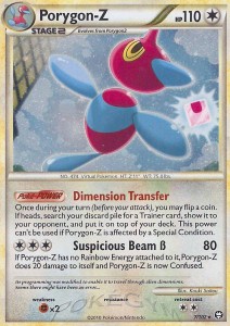 What it is– An attacker or a tech card. Its Poke-Power lets you flip a coin, and if heads put a trainer card from your discard pile to the top of your deck. His attack does 80 damage for CCC. If Porygon Z has no Rainbow Energy on it, he does 20 damage to himself and confuses himself.