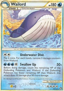 What it is– A main attacker. Wailord is a 180 HP Behemoth that can take a punch. His second attack costs FFFC, and does 50 damage or 100 if Wailord has more remaining HP then the defending. His first attack costs CC and lets you flip 2 coins, you can heal 3 damage counters for each heads.